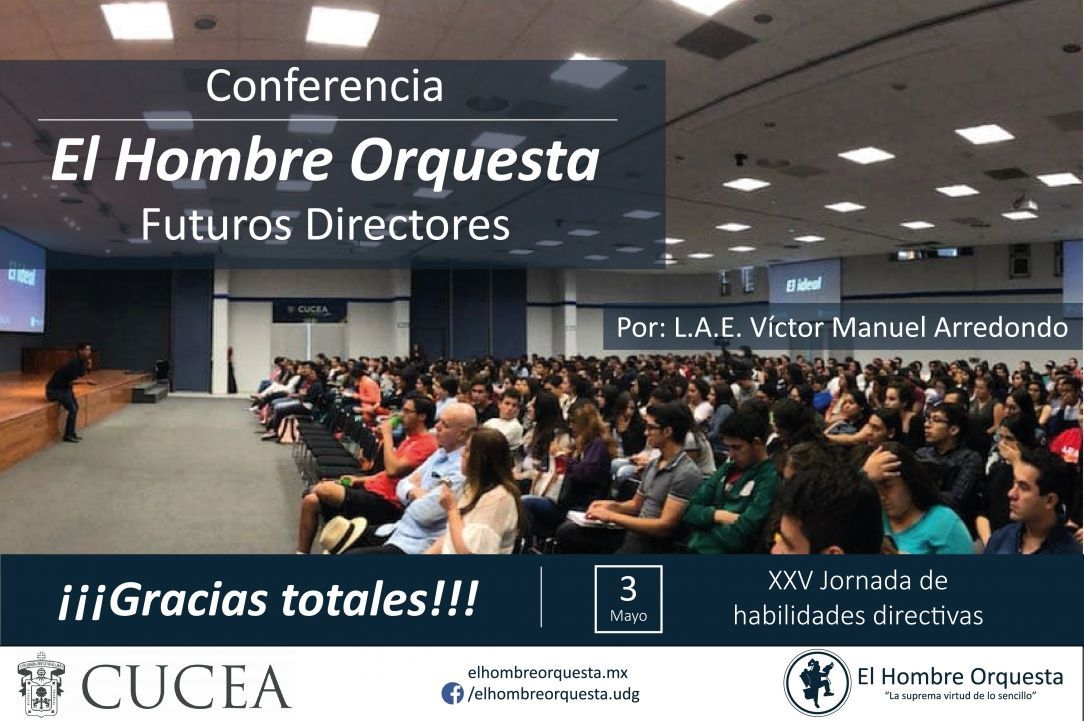 En el marco de la XXV JORNADA DE LIDERAZGO Y HABILIADES DIRECTIVAS, El Centro Universitario de Ciencias Económico Administrativas (CUCEA) invita a la comunidad universitaria a la conferencia El Hombre Orquesta: "Futuros Lideres" Una conferencia que busca despertar en los estudiantes el espiritu por emprender sus propias empresas y emprendimentos.